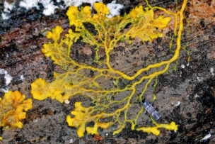 一つは変形菌(真正粘菌)で、普段は単細胞が融合した巨大な多核体として振る舞い、条件が整うと色鮮やかな子実体を形成する。